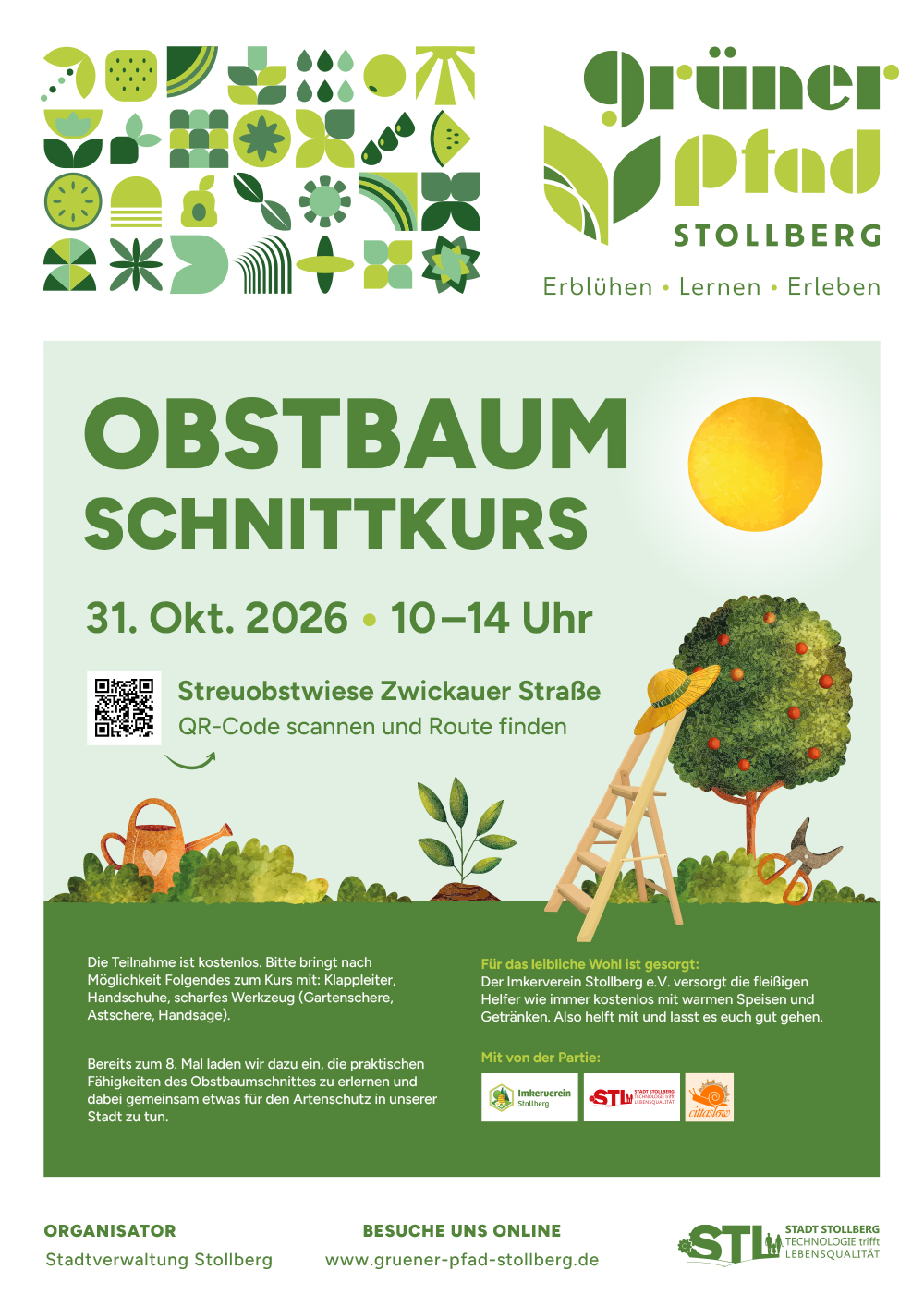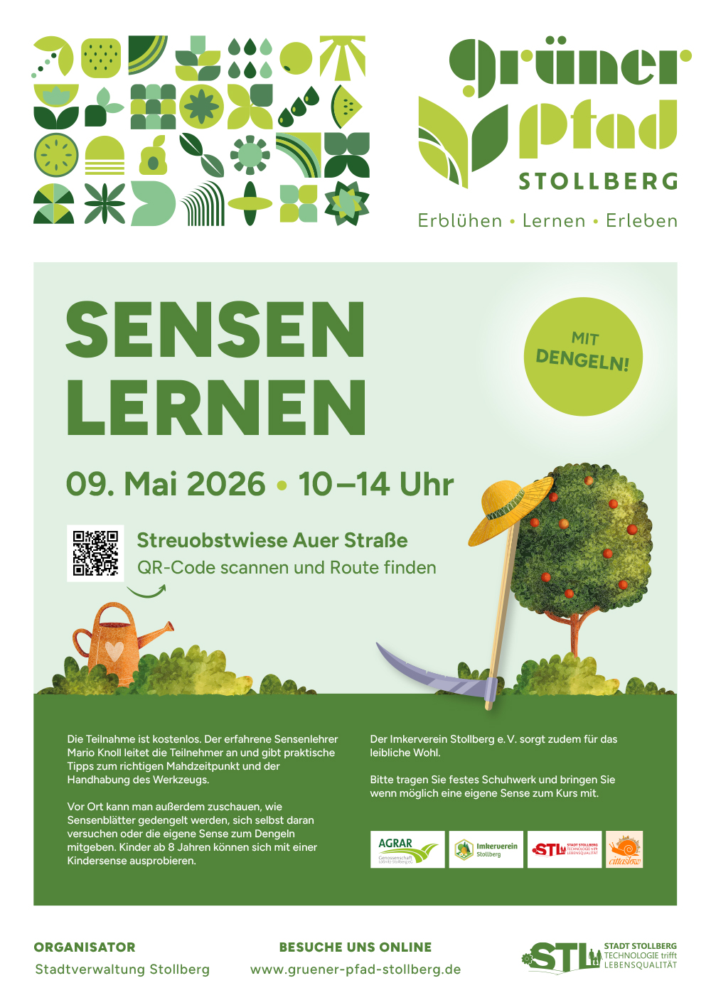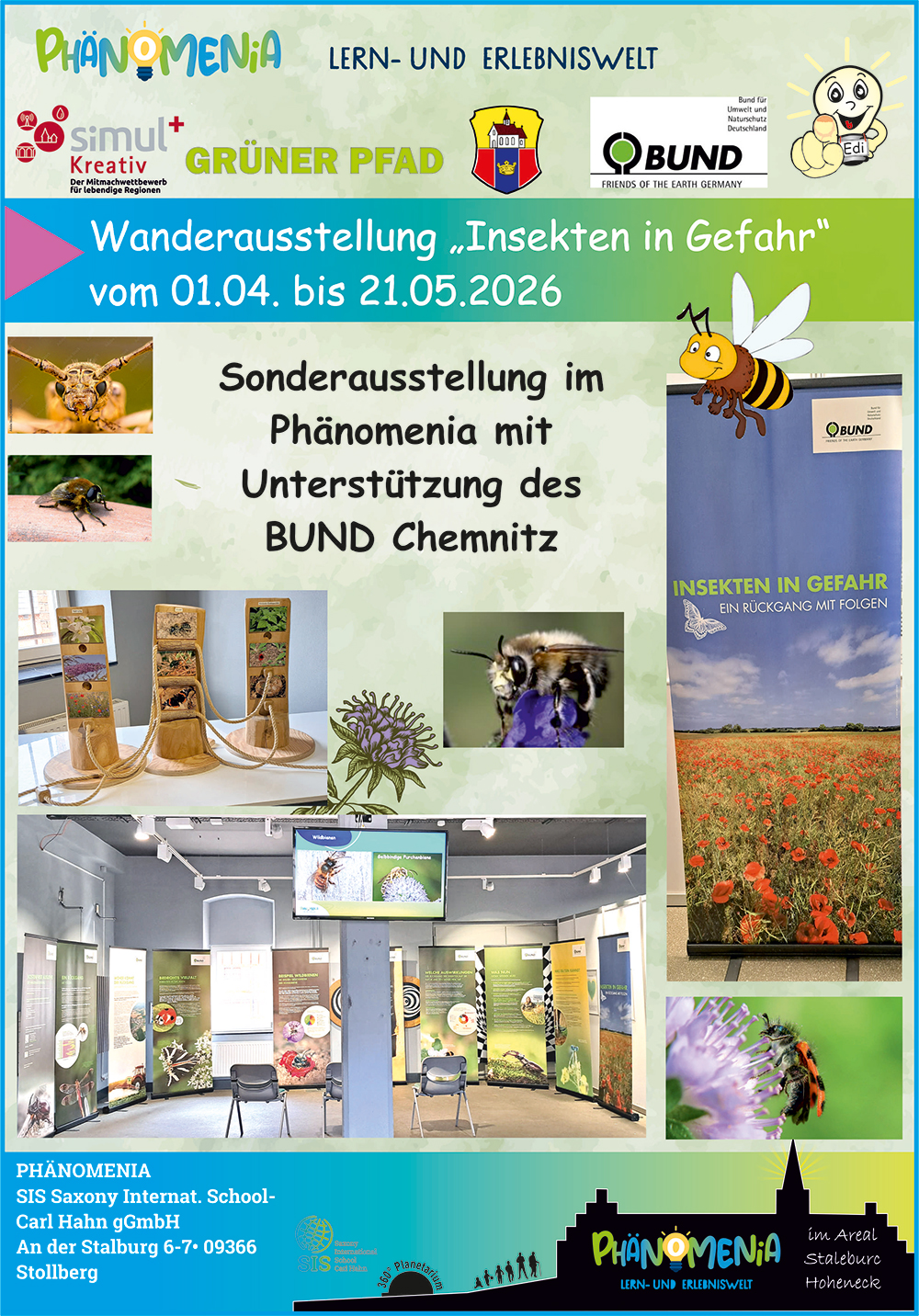 Gemeinsam mit vier starken Partnern plant die Stadt Stollberg die Schaffung zusätzlicher Lebensräume für Wildinsekten. Diese sollen durch den „Grünen Pfad Stollberg“ miteinander verbunden werden und als Orte der Umweltbildung und Erholung für alle Stollberger und ihre Gäste entwickelt werden. Nach dem Vorbild der Insekten arbeiten dabei viele fleißige Partner an einem gemeinsamen großen Ziel. Zusammen mit der interaktiven Lern‐und-Erlebniswelt Phänomenia, der Hochschule Mittweida, der Firma VWL aus Gablenz und unserer Agrargenossenschaft soll Stollberg Neues erleben, Wertvolles lernen und weiter erblühen.